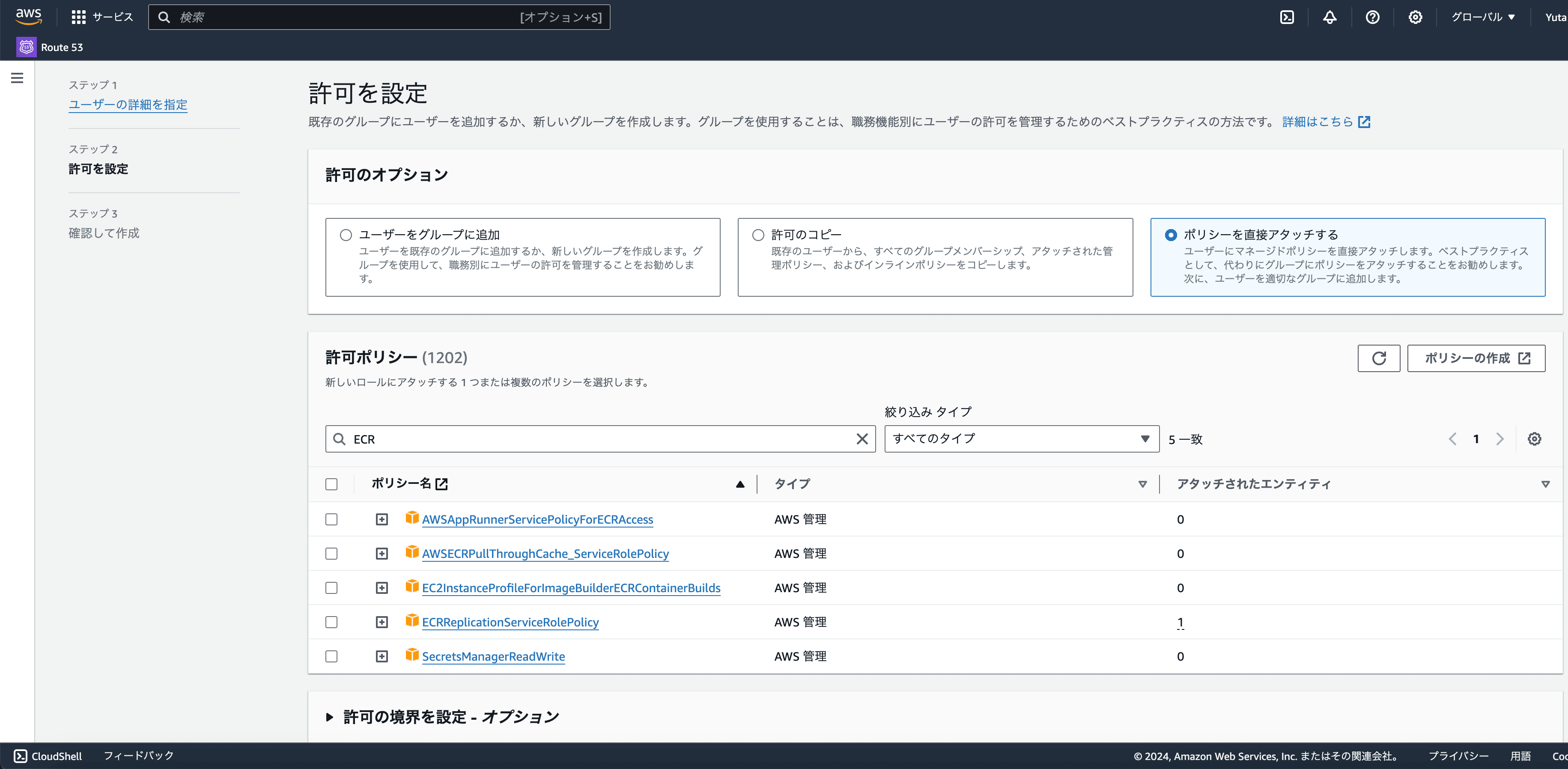 「AmazonEC2ContainerRegistryFullAccess」「AWSAppRunnerServicePolicyForECRAccess」ポリシーをアタッチし、ユーザーを作成します