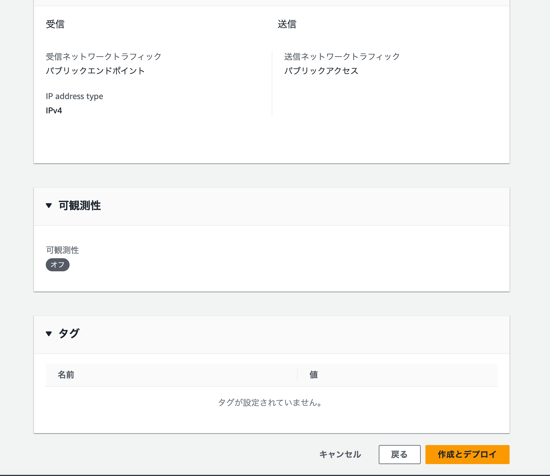 ここまでの入力値を確認し、ページを下にスクロールして 作成とデプロイ を押します。